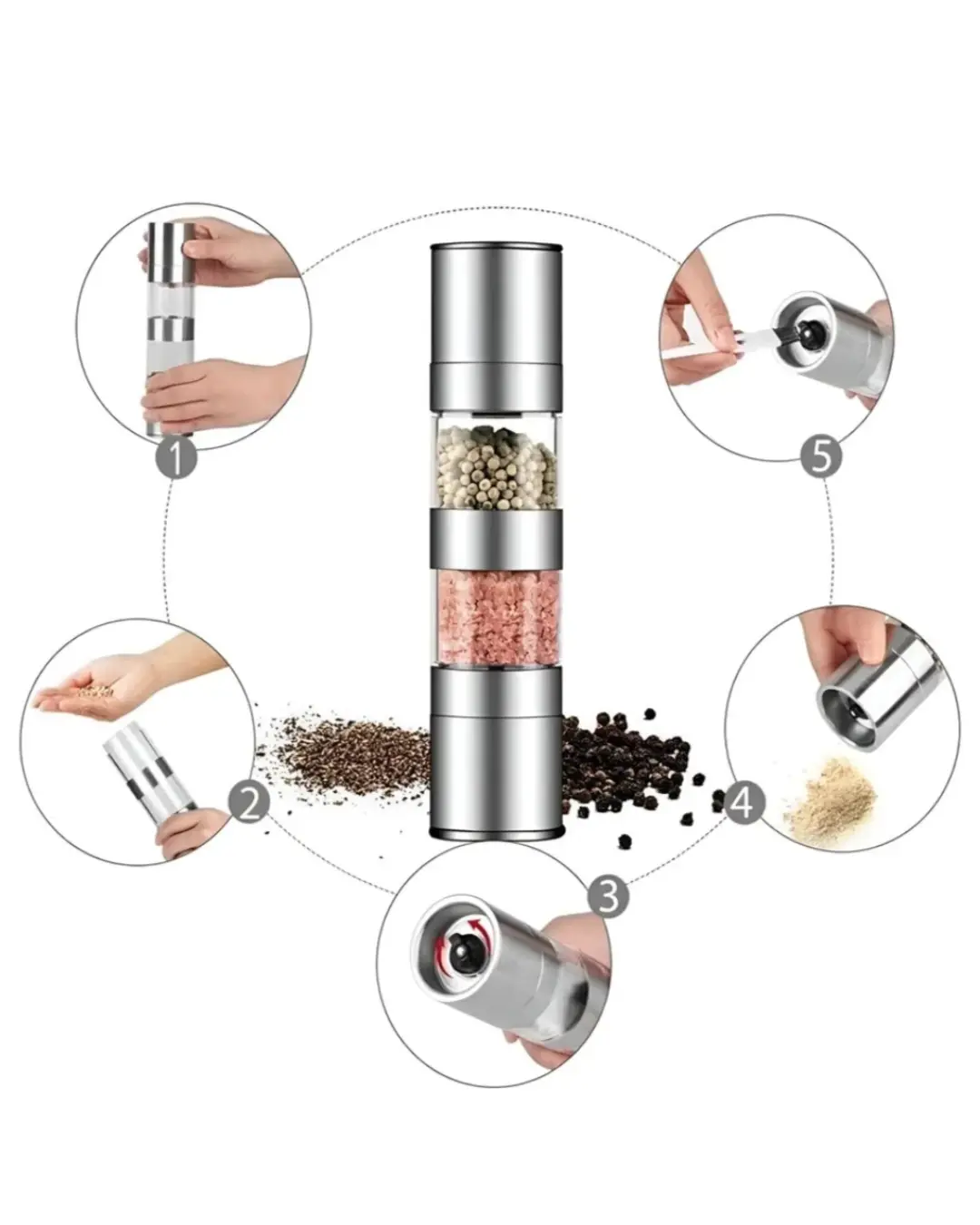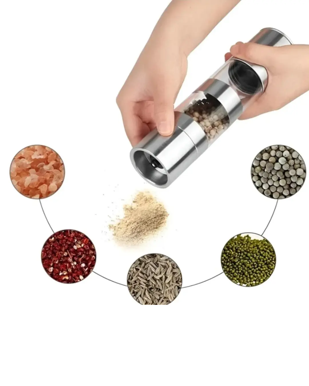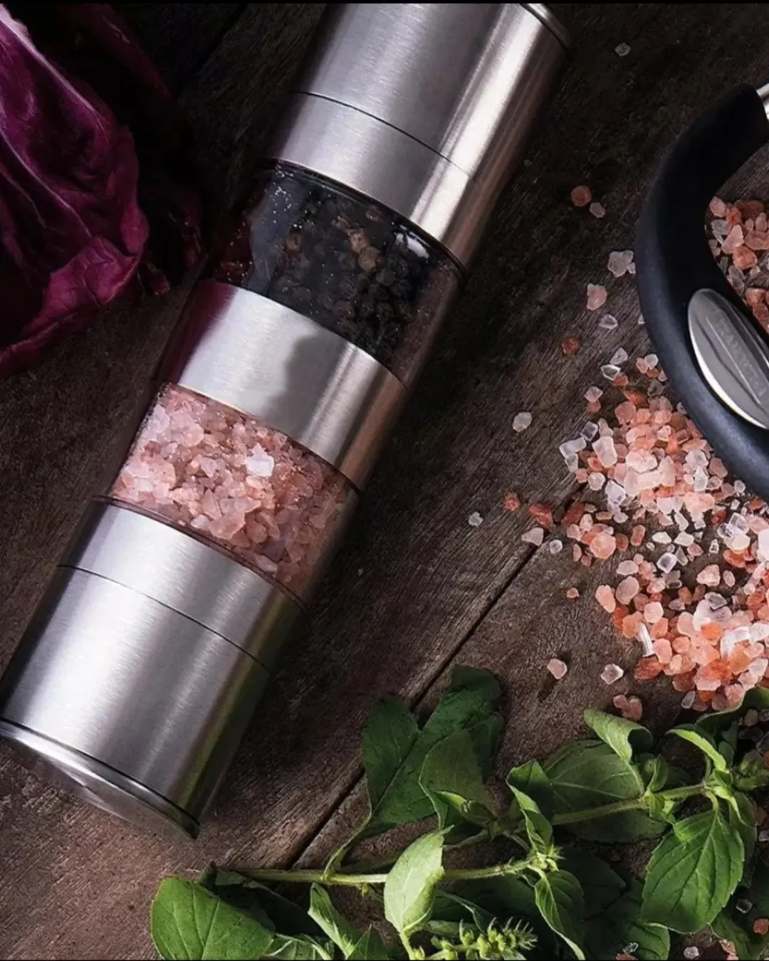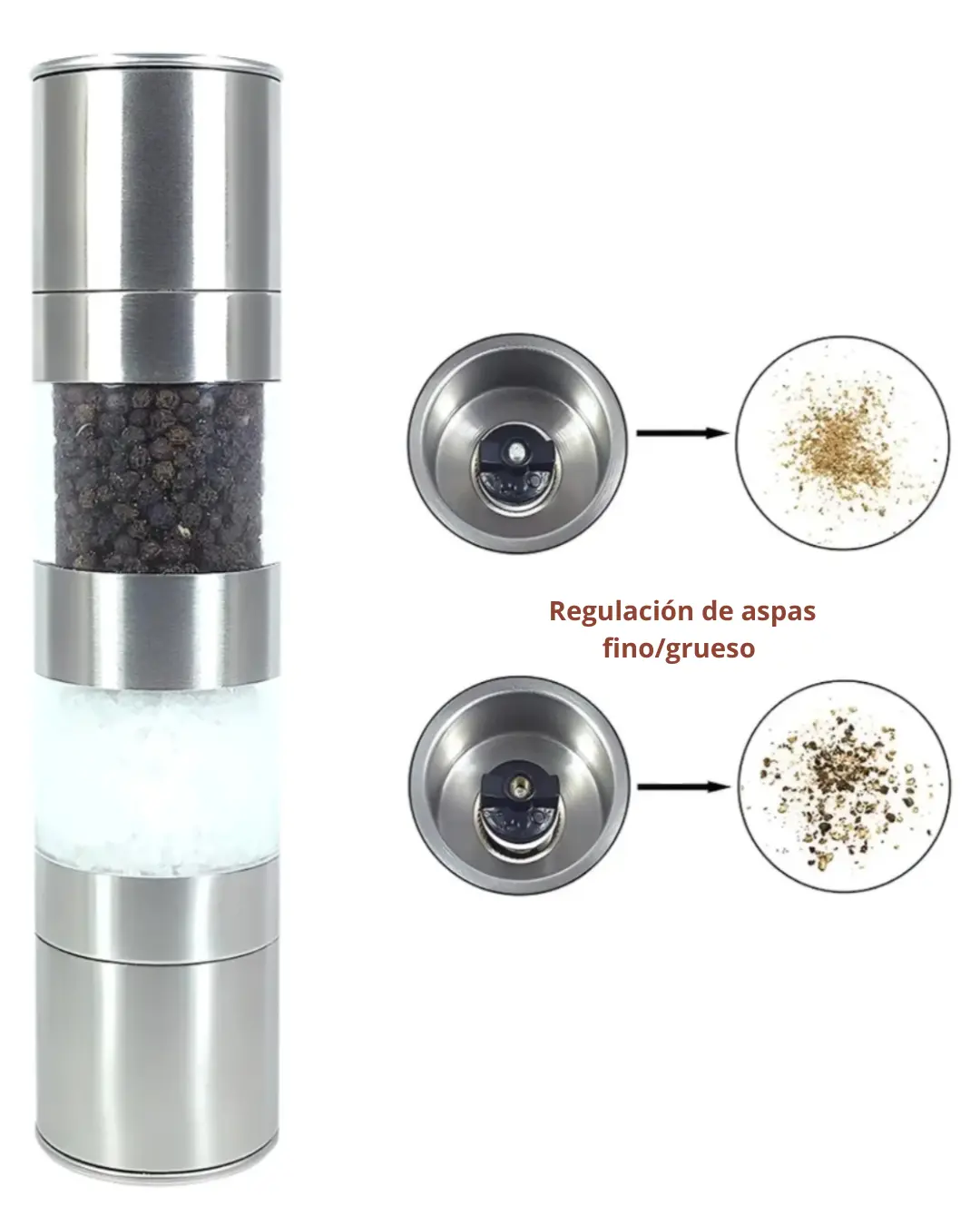 Llevá tus condimentos al siguiente nivel con este molinillo doble de 22 cm, ideal para sal y pimienta o especias secas. Su estructura de acero inoxidable asegura durabilidad, mientras que su diseño permite ajustar el grosor del molido al gusto. Perfecto para mesas, cocinas o como regalo elegante.